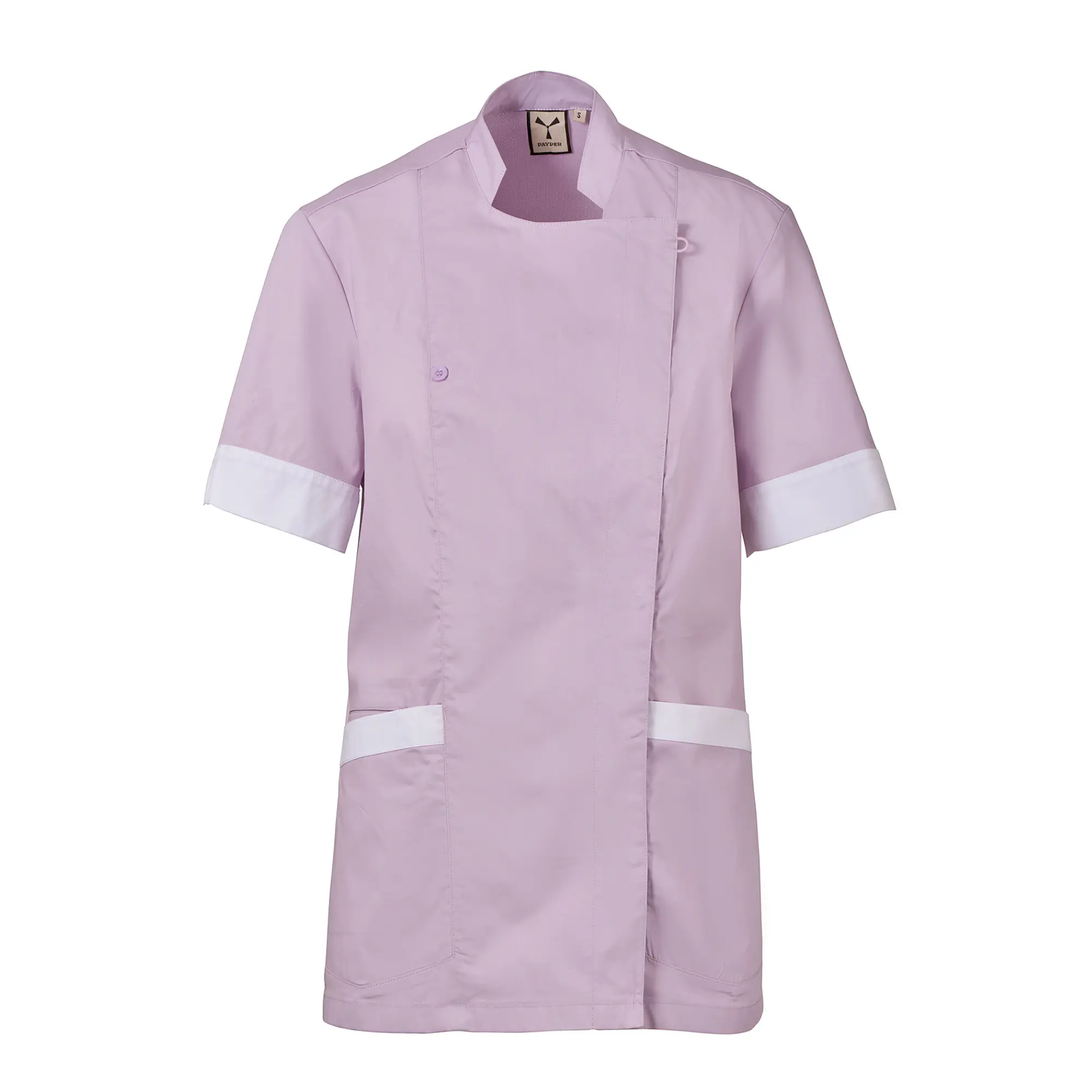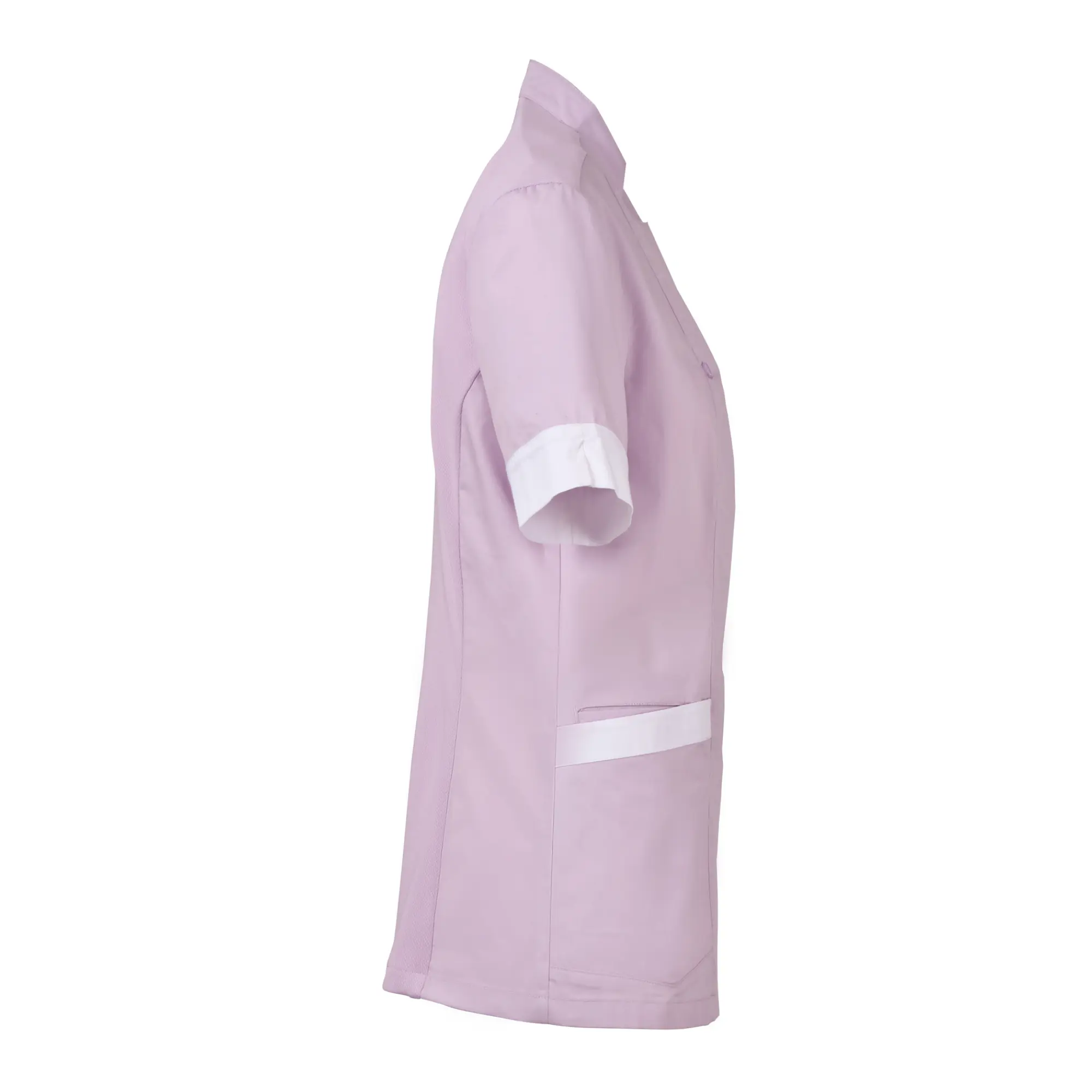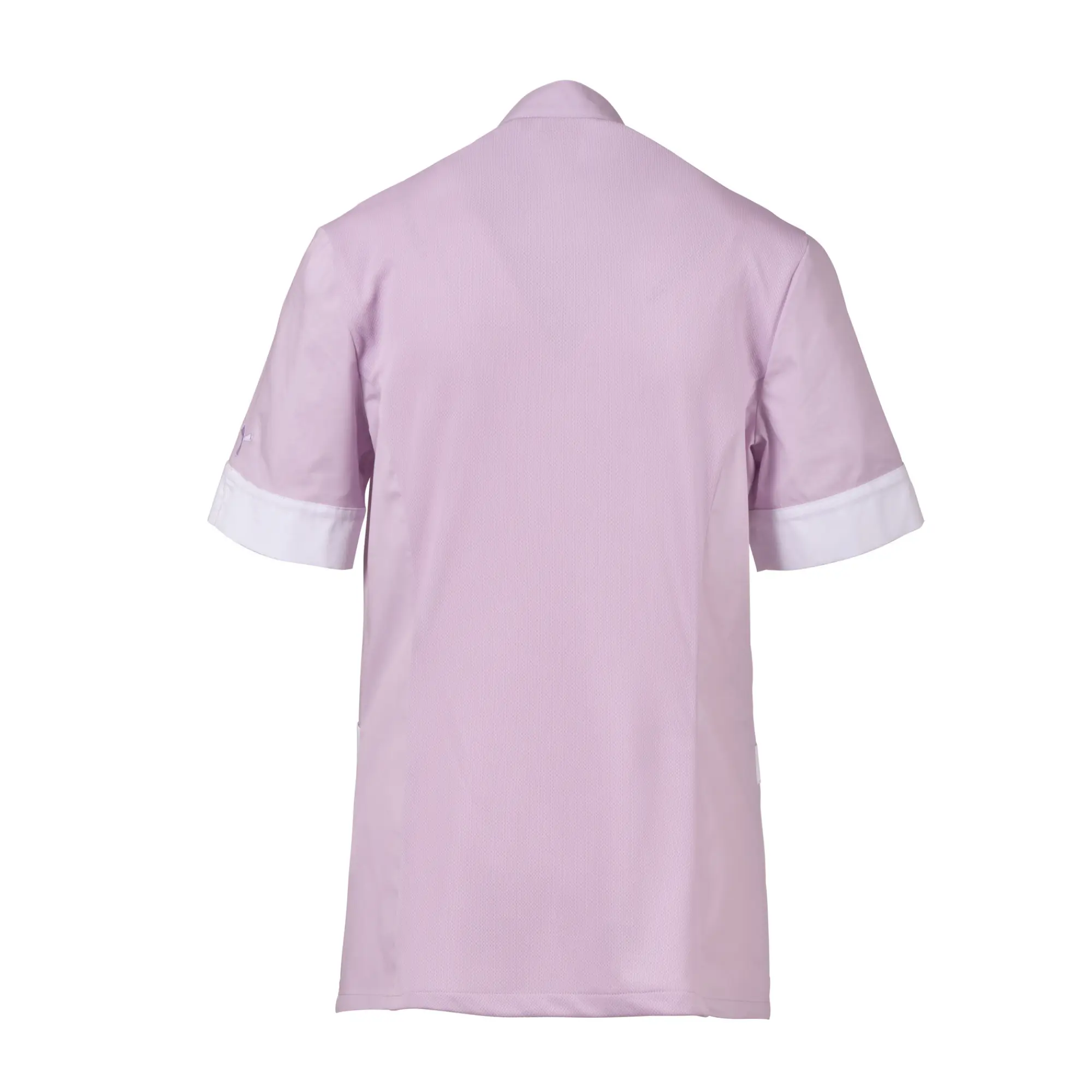 Γυναικεία κοντομάνικη ποδιά με γιακά μάο, υλοποιημένη με ποπλίνα βαμβακερή, πολυεστέρα και Lycra® T400®, συνδυασμένη με ευχάριστο διχτυωτό ύφασμα στην πλάτη, για να εξασφαλίζει τη μέγιστη διαπνοή και ελευθερία κινήσεων. Σταυρωτό κλείσιμο με αυτόματα κουμπιά, πέτο που αναδιπλώνει και στερεώνεται στο στήθος με κούμπωμα ενός ορατού κουμπιού, δημιουργώντας το εφέ κολάρου υψηλής ραπτικής και ένα καινοτόμο V ντεκολτέ. Χρωματικό κοντράστ σε άκρες μανικιών και άκρα τσέπης. Δύο εξωτερικές τσέπες χαμηλά, εκ των οποίων μία με θήκη smartphone. Εικονική κεντητή έλικα Payper συνδυασμένων αποχρώσεων στο μανίκι. Πιέτες στο πίσω μέρος.