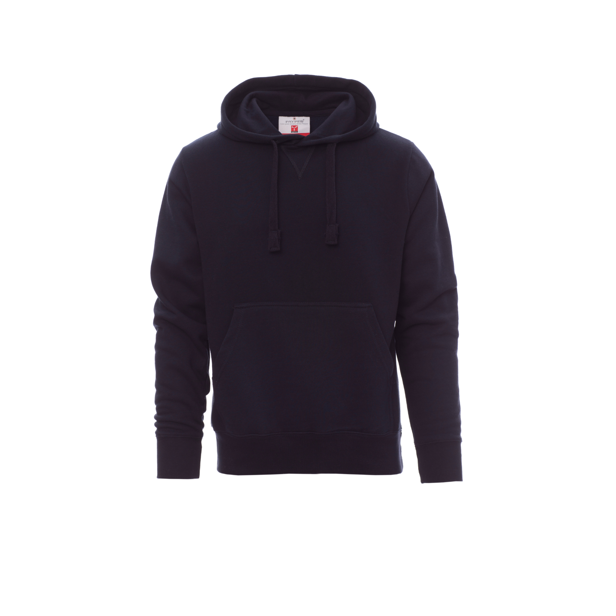 Men’s hoodie with matching drawstring, V-design neck stitching, kangaroo pockets, fitted sleeves, stretch rib cuffs and hem, reinforced seams. Matching inner neck tape.