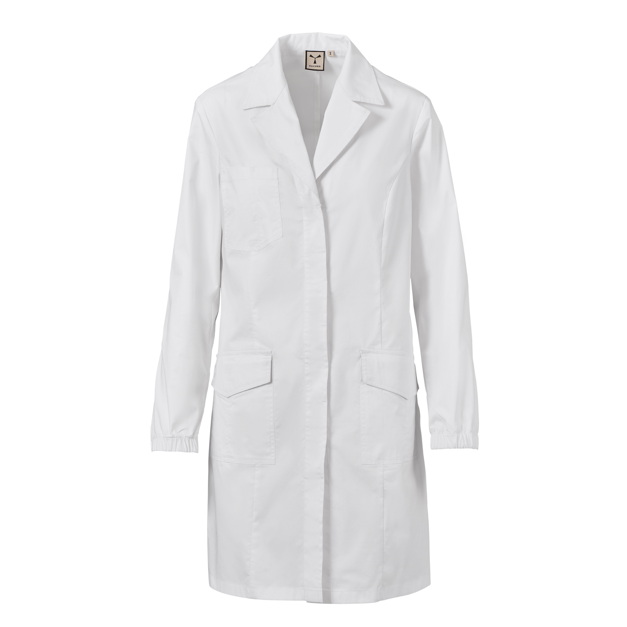 Γυναικεία μακριά ποδιά, με κλασικό πέτο γιακά, υλοποιημένη με ποπλίνα βαμβακερή, πολυεστέρα και Lycra® T400®, με εξαιρετικές ιδιότητες ελαστικότητας και διαπνοής. Καλυμμένο κούμπωμα, μακρύ μανίκι με λάστιχο που σφίγγει στον καρπό. Τρεις φαρδιές εξωτερικές τσέπες: μία στο στήθος, με θήκη για στυλό· δύο κάτω με καπάκι, μία εκ των οποίων με την εμβληματική έλικα Payper κεντημένη με συνδυασμένες αποχρώσεις. Πίσω μέρος με κεντρικό άνοιγμα και σκίσιμο στο κάτω μέρος, για ευκολία στην κίνηση.