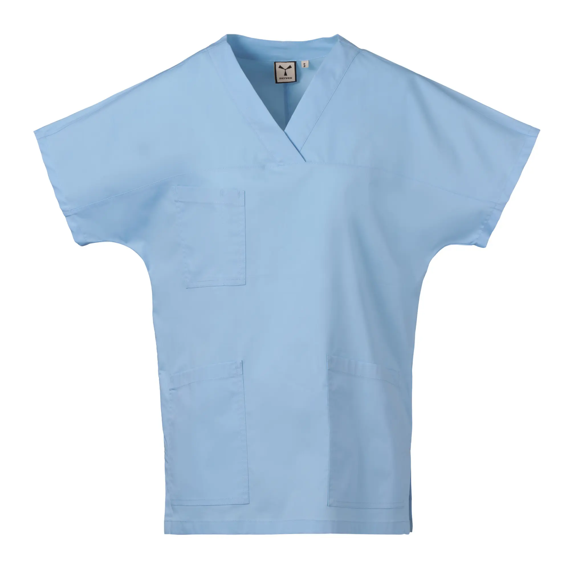Κοντομάνικη στολή, με V γιακά, υλοποιημένη με ποπλίνα βαμβακερή, πολυεστέρα και Lycra® T400®, με εξαιρετικές ιδιότητες ελαστικότητας και διαπνοής. Οριζόντιο άνοιγμα στο μπροστινό μέρος. Τσεπάκι στο στήθος με θήκη για στυλό. Δύο φαρδιές κάτω τσέπες με καπάκι. Πίσω μέρος με κεντρικό άνοιγμα. Πλαϊνά σκισίματα για ευκολία στις κινήσεις.