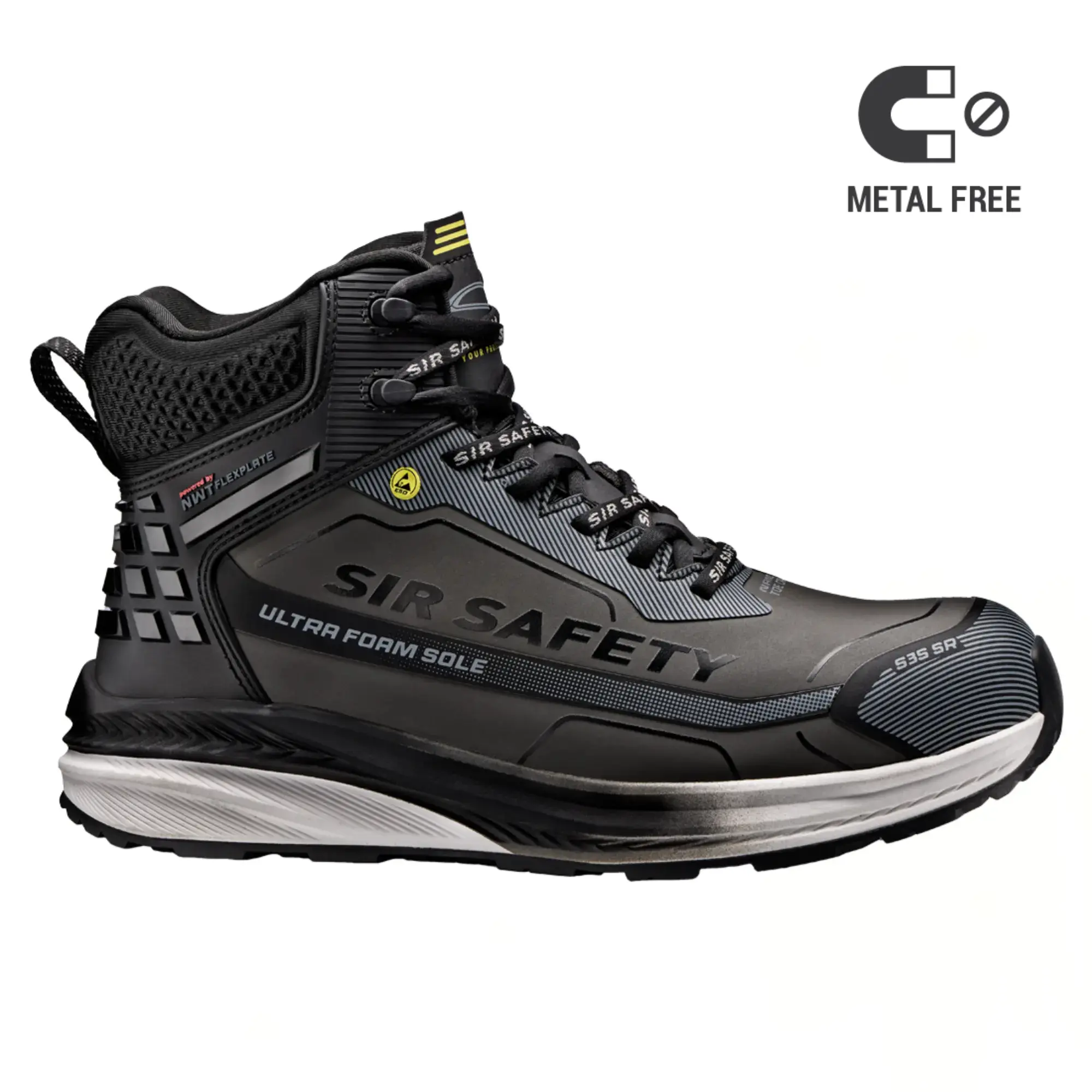 Υψηλά υποδήματα ασφαλείας με Nano fiberglass προστατευτικό κάλυμμα δακτύλων και ενδιάμεση σόλα NWT από υπέρ-ελαφρύ μη υφαντό υλικό τύπου PS. Χωρίς μεταλλικά στοιχεία (Metal Free).
