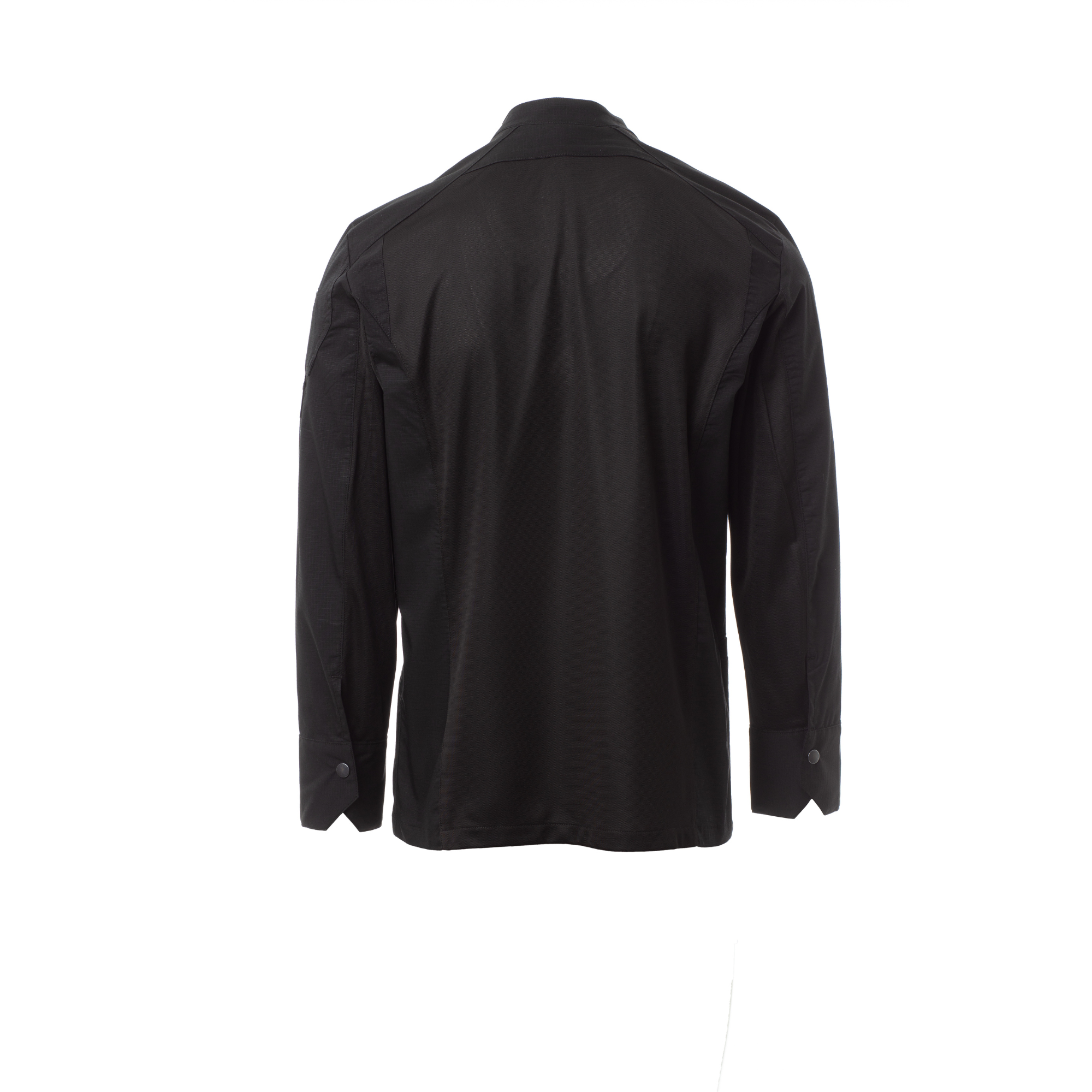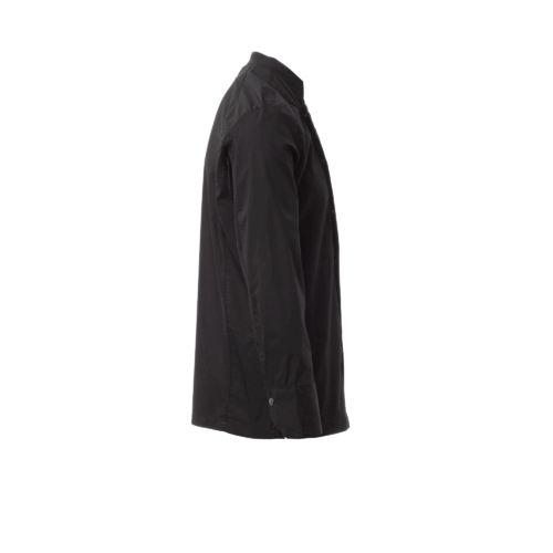 Σακάκι μάγειρα με γιακά μάο, υλοποιημένο με ripstop βαμβακερό και Lycra® T400®, με εξαιρετικές ιδιότητες ελαστικότητας και διαπνοής και με ευχάριστο στην υφή δικτυωτό ύφασμα για πλάτη, μασχάλη και κάτω από τη μασχάλη, για ενίσχυση της διαπνοής. Σταυρωτό κλείσιμο με αυτόματα κουμπιά, πέτο που αναδιπλώνει και στερεώνεται στο στήθος με κούμπωμα ενός ορατού κουμπιού, που δημιουργεί το εφέ κολάρου υψηλής ραπτικής και ένα καινοτόμο V ντεκολτέ. Μακρύ μανίκι με μανσέτα πουκάμισου, που κλείνει με ορατό τρουκς. Εικονικό μπάλωμα διαμορφωμένο επάνω στον αριστερό ώμο, με ελικοειδές κέντημα συνδυασμένων αποχρώσεων, που διαθέτει τσεπάκι για στυλό. Πρακτική τσέπη για smartphone στη μέση.